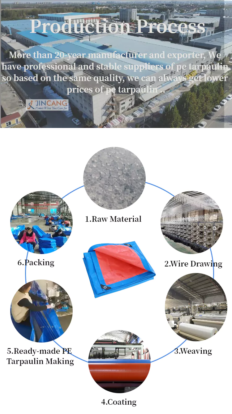 Tá Jincang ar cheann de na monaróirí gairmiúla Rolla Tarpaulin PE sa tSín, tá 90 GSM Strip PE Tarpaulin Roll pacáiste de réir an rolla. Is é an leithead de ghnáth 1.83m, 2m,4m,5m,6m.The Fad de ghnáth 63m,91, 100m 200m etc.And is féidir linn a shaincheapadh freisin mar do riachtanais. Úsáidtear go forleathan é le haghaidh cosanta lasmuigh, ag clúdach earraí, láithreáin tógála, críocha talmhaíochta, agus scáthláin shealadacha.